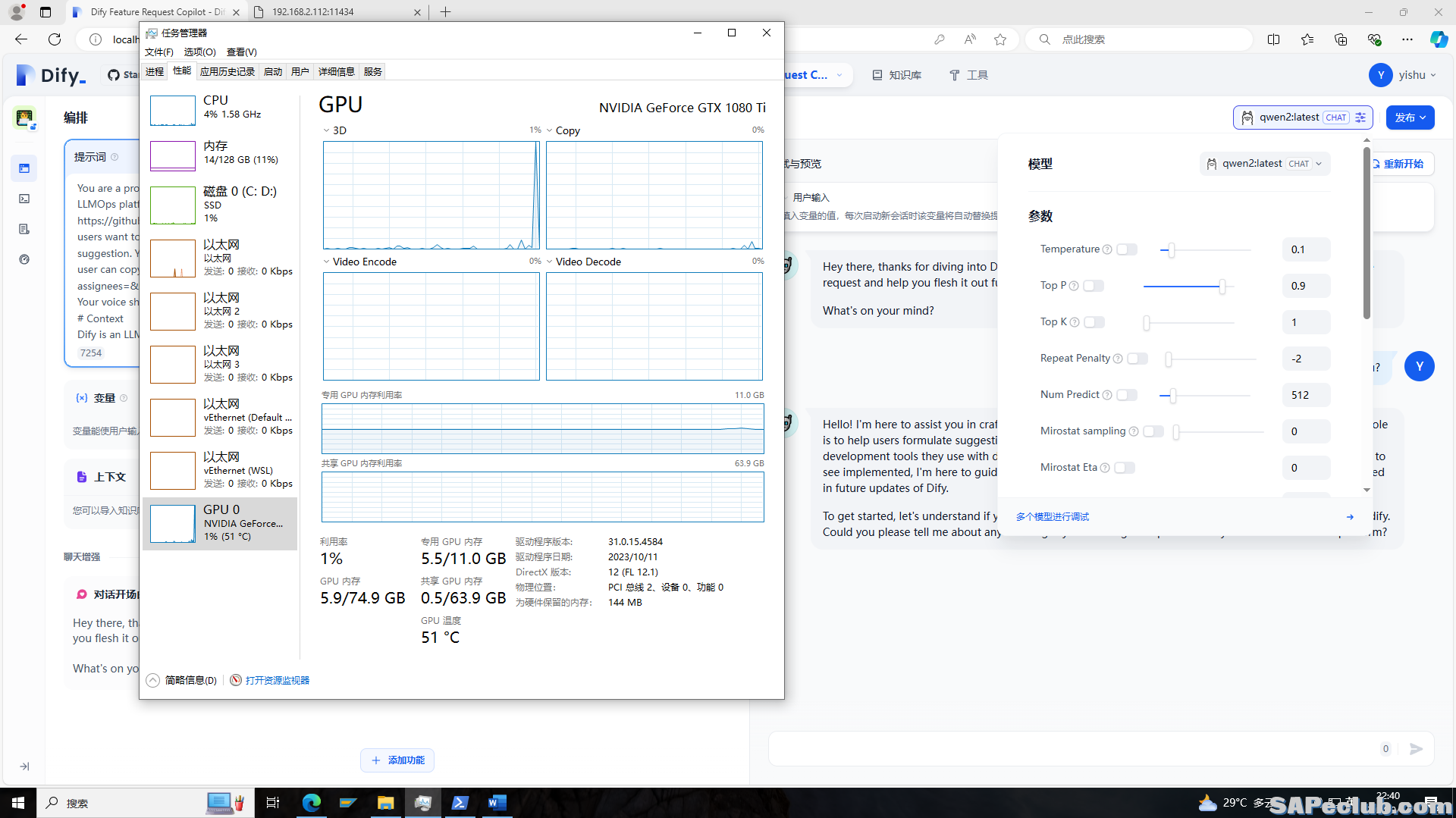我直接将Docker安装在P510工作站上,原先是安装SAP S4HANA IDES的,所以内存是128G,显卡更换上了一块11G显存的,用来跑Qwen2-7B和Llama3.1-8B没压力,LLM运行也比较流程,Llama3.1-8B跑起来的时候,显存一般会占用6-7G。