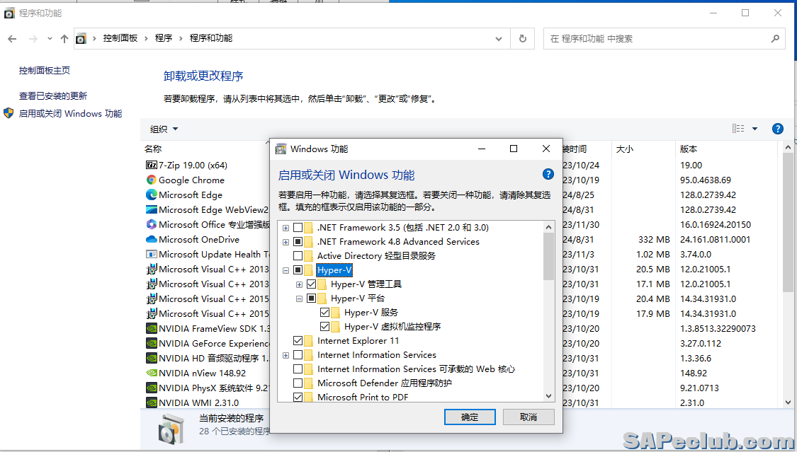或者通过:控制面板>程序和功能>启用或关闭Windows功能,开启 Hyper-V;然后在“Windows 功能”中,勾选Hyper-V、适用于Linux的Windows子系统这两项,点“确定”。