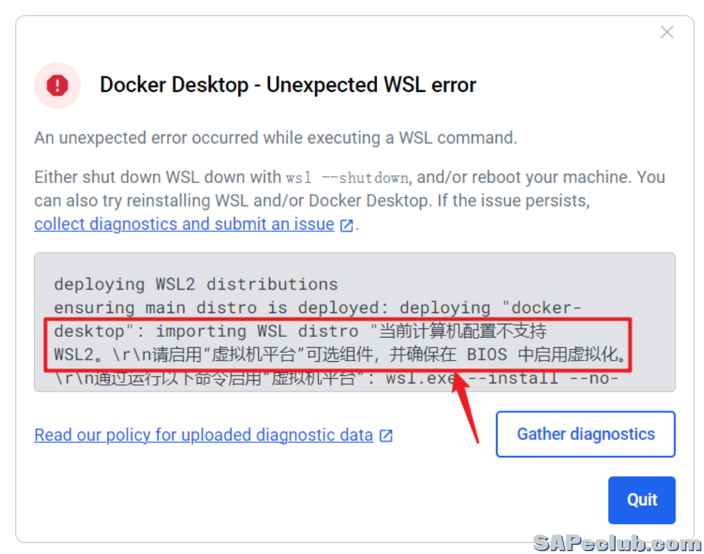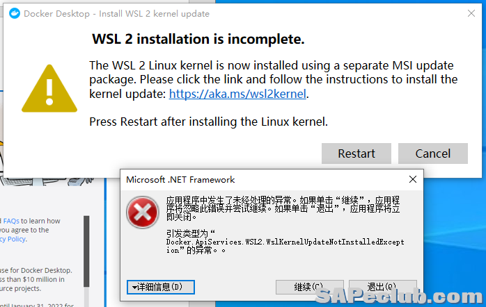详细报错信息:“Docker.ApiServices.WSL2.WslKernelUpdateNotInstalledException”的异常。