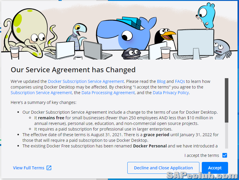 安装重启后,在电脑桌面上的“Docker Desktop”图标打开程序,这里点“Accept”接受。